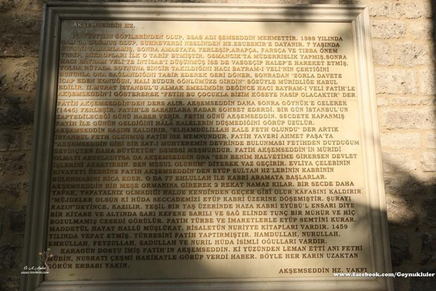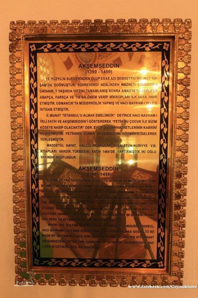 Fatih Sultan Mehmed in hocası Akşemseddin Hz. Türbesi Fatih Sultan Mehmed tarafından 1464 yılında yaptırılmıştır. Köveki taşından yapılmış kasnaksız bir kubbe ile örtülü altıgen planlı bir yapıdır. Akşemseddin Hz. nin sandukası 2.50×0.50m. boyutunda ceviz üzerine kabartma yazı ile süslü olan sanduka Osmanlı ağaç işçiliğinin güzel bir örneğidir.