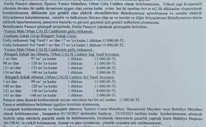 Panayır alanı olarak Orhan Çalış Caddesi belirlenmiştir.. açılacak stand ücretleri de aşağıdaki gibidir