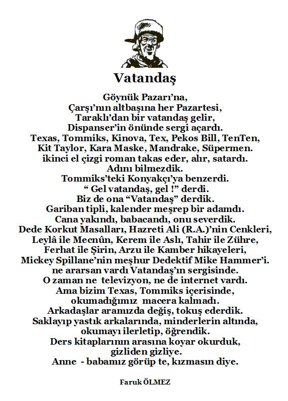 Göynüklü hemşehrimiz Faruk ÖLMEZ, geçmişteki anılarını şiirlerle anlatmaya devam ediyor.. Göynük şairinin anılarda kalan Göynük şiirlerinden Vatandaş